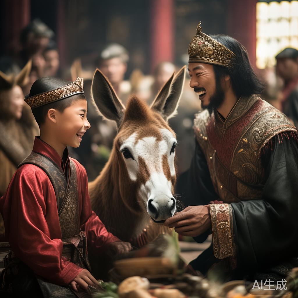 有一次,孙权在朝廷设宴,六岁的诸葛恪与父亲一起参加。诸葛瑾脸形特别修长,孙权想开玩笑,就趁着酒兴,命人牵来一头毛驴,在驴脸上写下“诸葛子瑜”四个字,以表嘲讽。众人见状,哈哈大笑,而诸葛瑾也显得尴尬。诸葛恪见了,走上前请示添写两个字。孙权便命人将笔递来。诸葛恪在“诸葛子瑜”四字后添上了“之驴”,变成了“诸葛子瑜之驴”。满座大臣见此,无不惊讶叹服。孙权看到诸葛恪如此聪慧,十分高兴,立刻把毛驴赏赐给他。